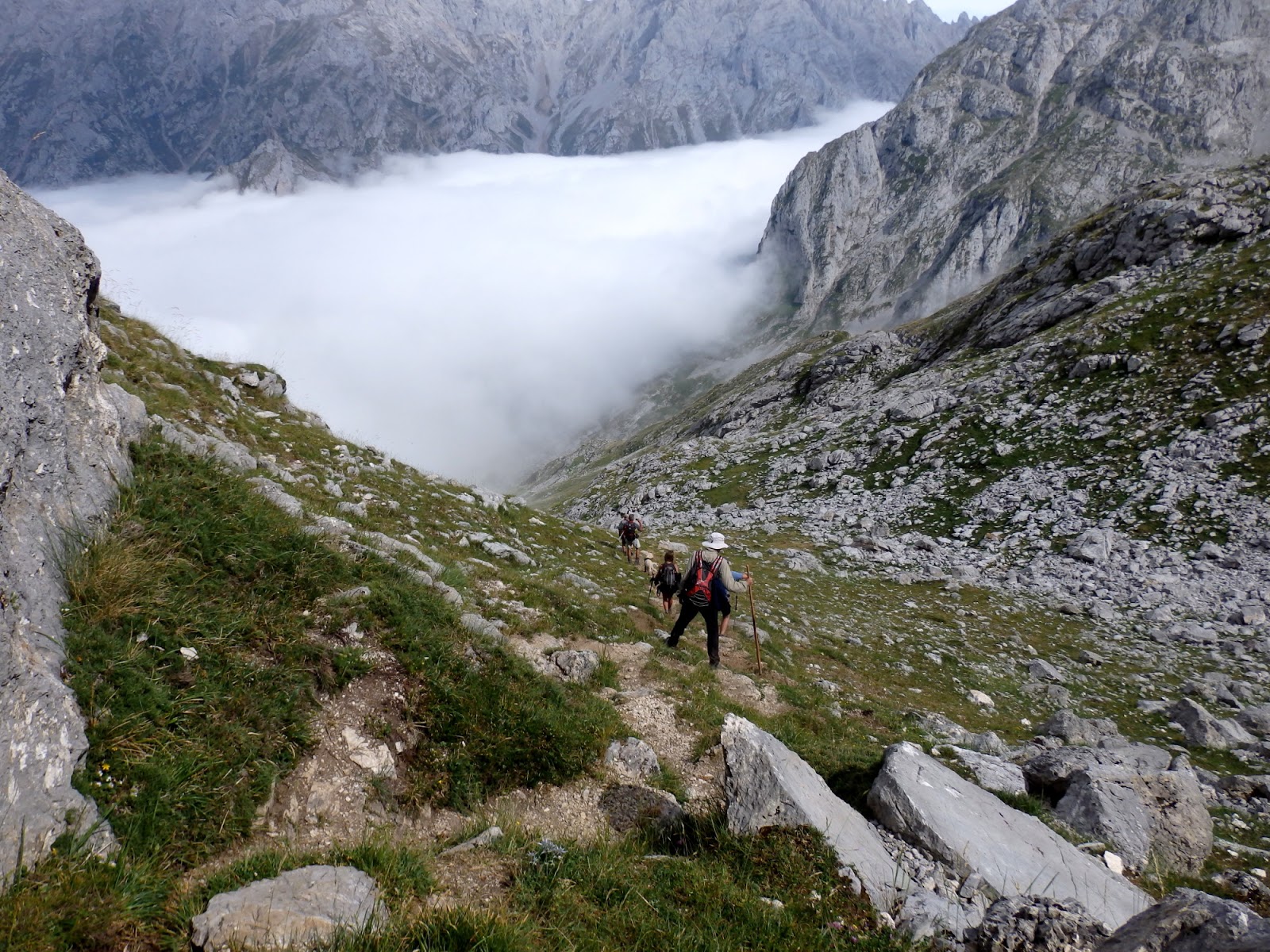 Aquí paramos para recuperar fuerzas y alimentarnos un poco. Un espeso mar de nubes nos impide ver lo que tenemos al otro lado del collado, collado Pandébano, Peña Main, etc.